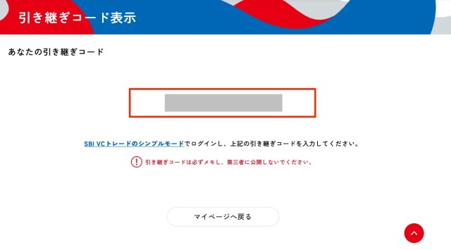 つぎに、口座開設完了後、引き継ぎコードを発行します。